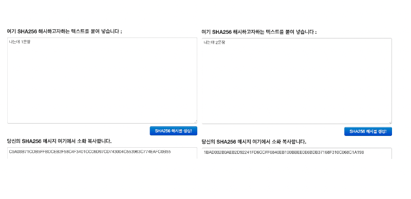 또한 숫자하나 차이인데도 해시 값이 패턴?을 가지지 않고, 전혀 다른 형식으로 출력되는 것을 확인할 수 있습니다.