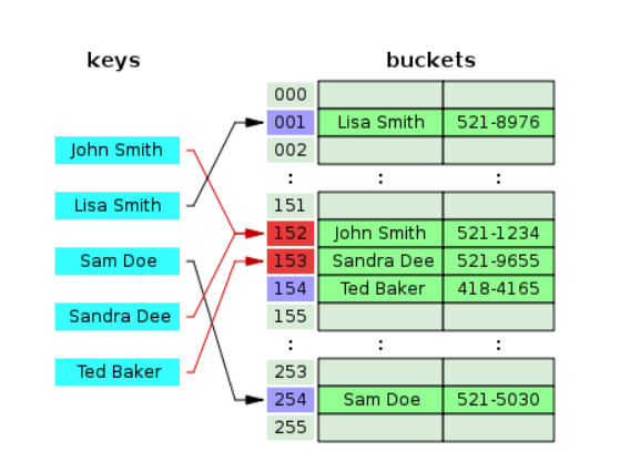 그림을 보면, John Smith와 Sandra Dee를 키로 넣었을 때 해시함수에 의해 같은 값은 152가 리턴된다고 해봅시다. 그런데 John은 152번에 저장되었지만, Sandara Dee는 152에 덮어 씌워지지 않고, 153번에 저장되어 있습니다. 다음 153번을 리턴 받은 Ted Baker는 이미 Sandra Dee가 저장되어 있기에 다음 빈 버킷은 154에 저장되었습니다.