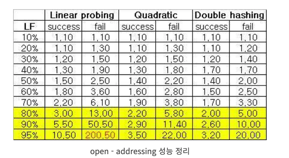 탐색 방식에 따라 개방 주소법의 해시의 성능이 달라지지만, 가장 큰 영향을 미치는 요소는 load factor입니다.