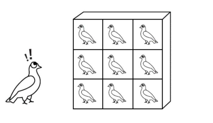 비둘기집 원리란 수학에서 자주 사용되는 원리로, 단순히 표현함 n개의 비둘기집에 n+1 마리의 비둘기를 집어넣으려고 하면, 반드시 어떤 한 비둘기집에는 반드시 2마리 이상의 비둘기가 들어가게 된다는 원리를 말합니다.
