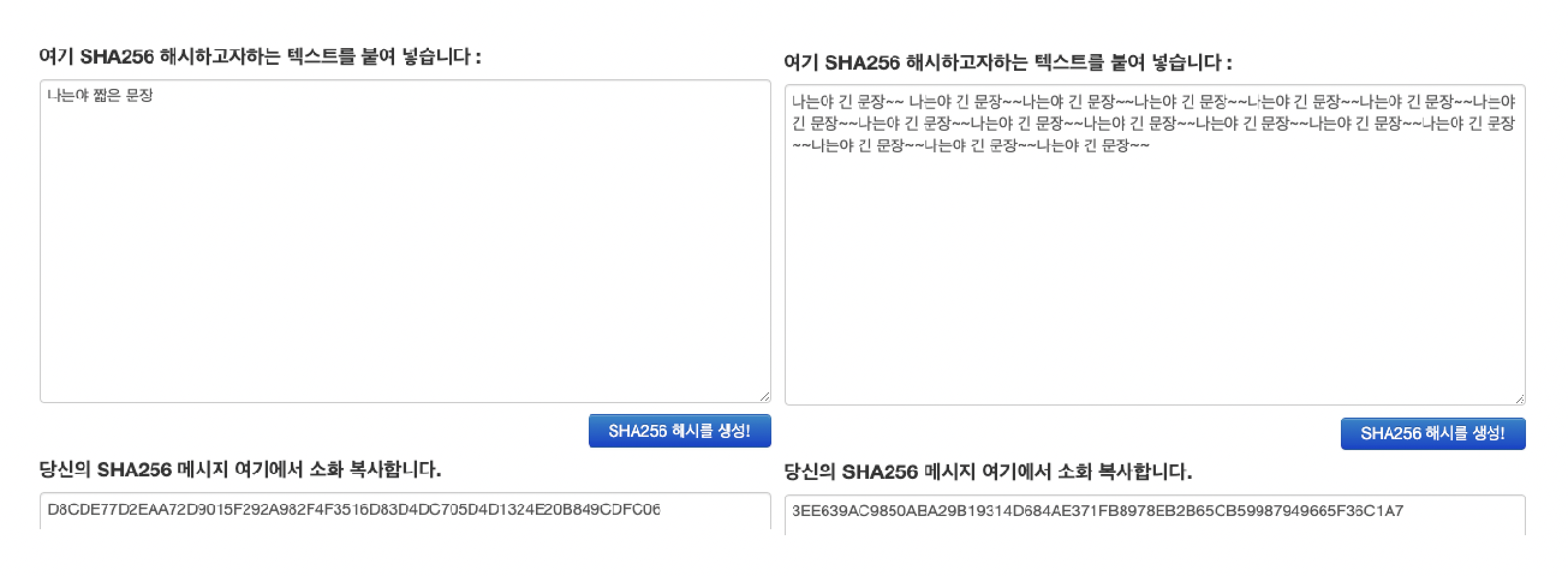 우선 첫번째 특성을 살펴보면, 입력값이 짧든 길든 항상 동일한 길이의 해시값이 출력된다는 것을 알 수 있습니다.