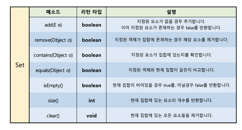 Set인터페이스에 선언할 메서드들을 살펴본 후 각각에 대해 좀더 상세히 다루어보겠습니다.