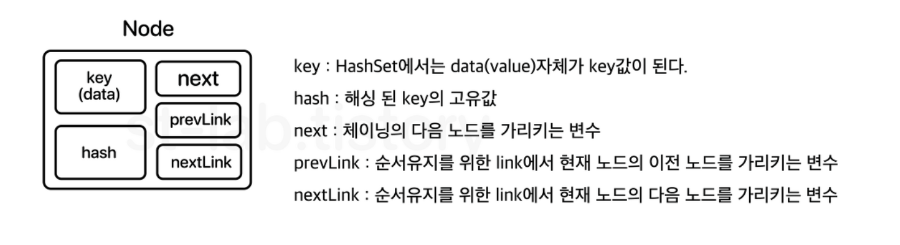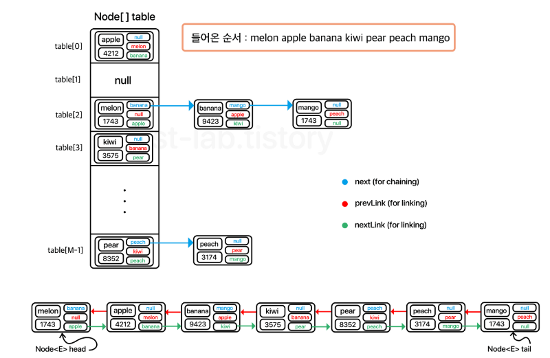위와 같은 단점을 보완하기 위해 HashSet과 동일하게 table에 저장을 하되, 순서를 보장할 수 있도록 LinkedList의 기능을 추가해 준것입니다.