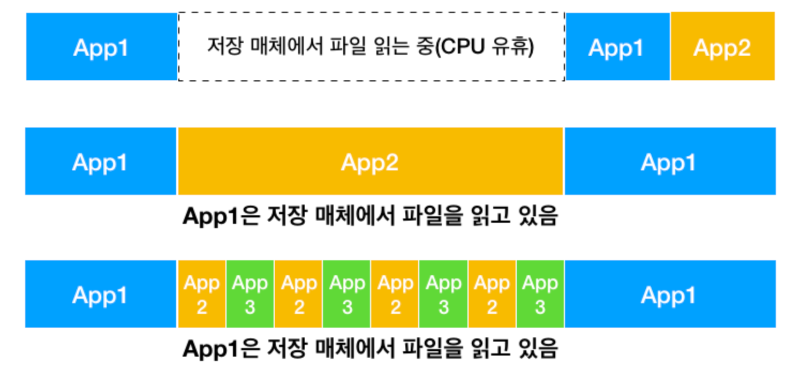 예를 들어 프로그램 App2가 디스크(느린 속도)와 같은 입출력(I/O) 장치에 접근하여 데이터를 읽고 쓰는 동안, CPU는 유휴 상태에 빠지게 됩니다. 즉 이 시간 동안 CPU는 어떠한 작업도 수행하지 않는데, 이는 컴퓨팅 자원을 비효율적으로 사용하는 것을 의미합니다. 왜냐하면 입출력 작업은 CPU 처리속도에 비해 상대적으로 매우 느리기 때문입니다.
