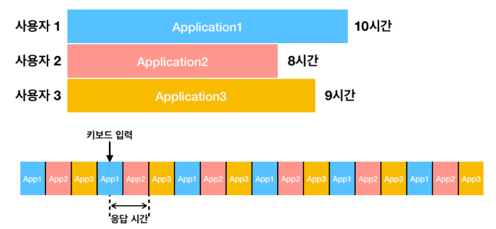 이때 응답 시간을 최소화하기 위해 응용 프로그램이 CPU를 점유하는 시간을 잘게 쪼개어 실행될 수 있게 해 줍니다.