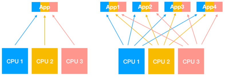 - 멀티 프로세싱 : 여러 CPU에서 하나의 응용 프로그램을 병렬로 실행해서, 실행속도를 높이는 기법
