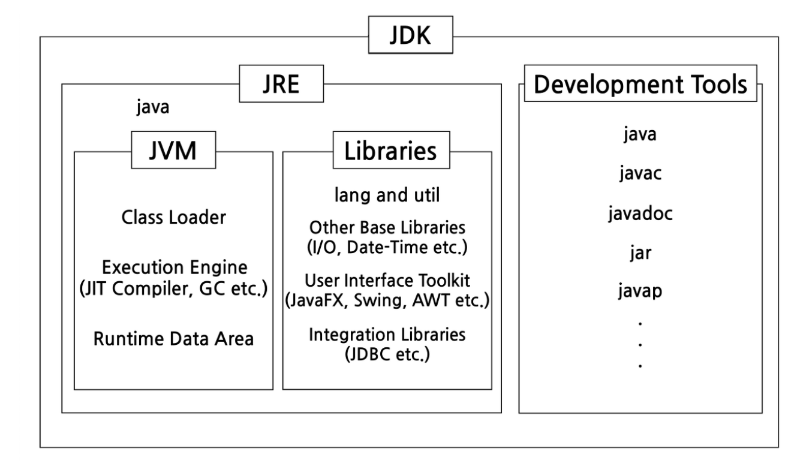 위 그림에서 볼 수 있듯이 JDK는 JVM,JRE를 모두 포함하고 있고, 자바로 개발하는데 필요한 development tools 또한 포함하고 있습니다.