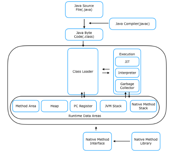 위 그림은 자바 프로그램이 실행되면 어떠한 과정을 거치는지 보여주는 그림입니다. 전반적인 과정에 대해 미리 살펴본 후 밑에서 더욱 세세하게 알아보겠습니다!