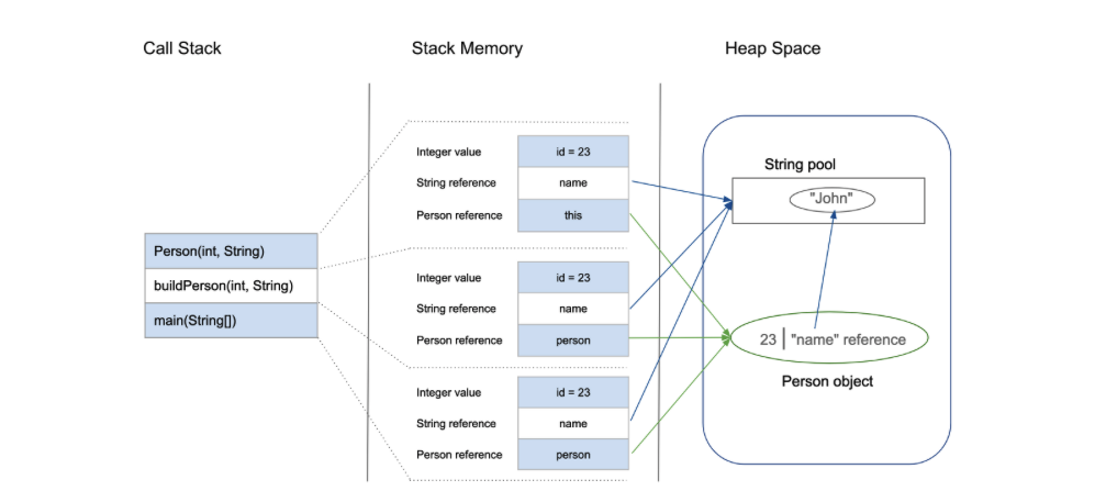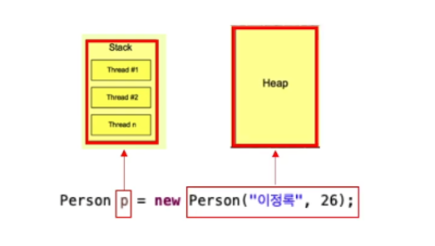위와 같이 Person p = new Person();과 같이 클래스를 생성할 경우, new에 의해 생성된 클래스는 Heap Area에 저장되고, Stack Area에는 생성된 클래스의 참조인 p만 저장됩니다.