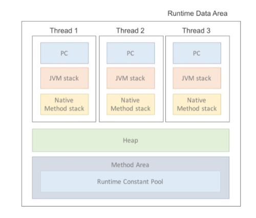 이때 Method Area, Heap Area 영역은 모든 쓰레드가 공유하는 영역이고, 나머지인 PC Register, Stack, Native Method Stack은 각 쓰레드 마다 생성되는 개별적인 영역입니다.