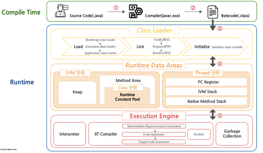 - 클래스 로딩 : 클래스 로더는 동적 로딩을 통해 필요한 클래스들을 로딩 및 링크하여 Runtime Data Area(JVM 메모리 영역)에 올립니다.