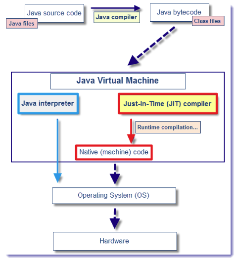 자바에서는 인터프리터와 JIT 컴파일러 방식 두 가지 방식을 혼합하여 바이트 코드를 실행합니다.