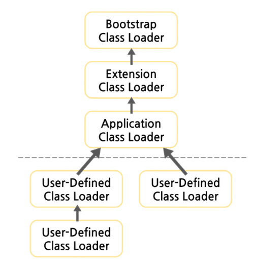 - 만약 캐시에 클래스가 없다면, 요청을 상위 클래스 로더에게 전달합니다. 이 과정은 부트 스트랩 로더까지 이어집니다. 이렇게 상위 클래스 로더로부터 차례로 확인하는 것은 클래스 로더의 위임 모델(delegation model)을 따르는 것