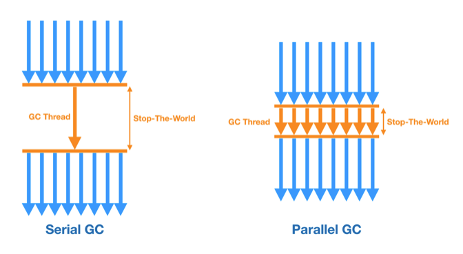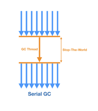 GC를 처리하는 스레드가 위 그림에서 확인하실 수 있듯이 싱글 스레드여서 가장 Stop-the-World 시간이 깁니다. Stop-the-world란 GC작업을 위한 스레드 외 모든 스레드가 종료된다는 것 기억하시죠??
