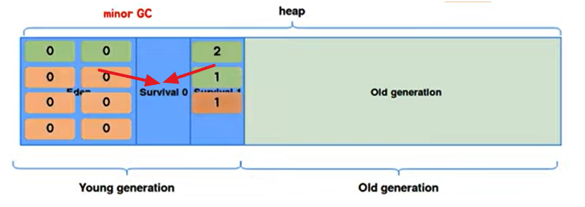 이후 또 Eden 영역이 가득 차면 다시 한번 minor GC가 일어나고, 이때도 위와 마찬가지로 Eden+Servivor2 영역에 있는 객체들이 비어있는 Survival0으로 이동한 후 age가 1 증가됩니다
