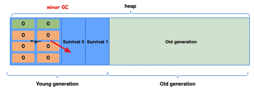이후 시간이 지나, Heap의 Eden 영역에 객체가 다 쌓이게 되면 Minor GC가 한번 일어나게 되고 참조 정도에 따라 Servivor0 영역으로 이동하거나 회수됩니다.