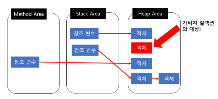 하지만 이렇게 생성된 Heap Area의 객체들이 메서드가 끝나는 등의 특정한 이벤트로 인하여 Heap Area 객체의 메모리 주소를 가지고 있던 참조 변수가 삭제되는 현상이 발생하면, 위 그림의 빨간색 객체처럼 어디서든 참조되고 있지 않은(UnReachable) 상태가 됩니다.