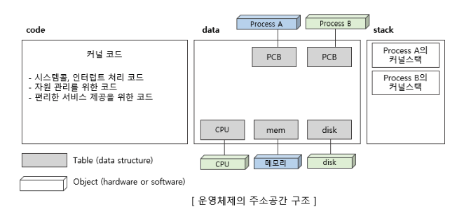 운영체제 또한 하나의 프로그램이기에, 커널 역시 코드,데이터,스택의 주소 공간을 가지고 있습니다.