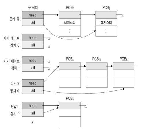 운영체제는 준비 상태에 있는 프로세스들을 줄 세기 위한(처음 메모리에 적재되는 경우도 포함) 준비 큐(Ready Queue)와, 특정 자원을 기다리는 프로세스(block 상태)들을 줄 세우기 위해 자원별로 장치 큐(Device Queue)를 둡니다.