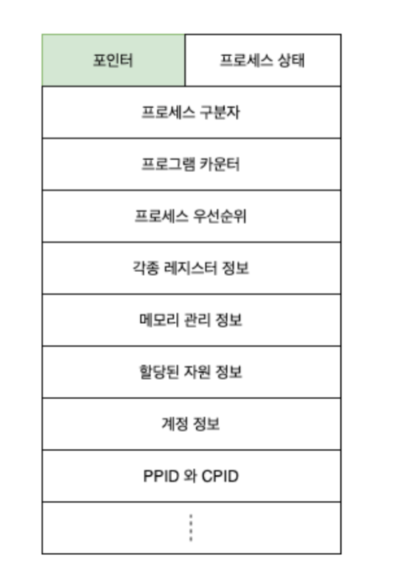 - 포인터 : 스케쥴링 큐의 다음 프로세스나 이전 프로세스를 가리키는 역할