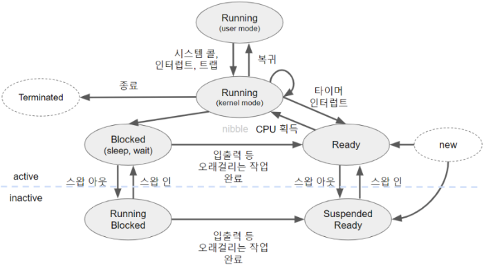 이 밖에도 프로세스가 생성 중이거나 종료 중인 일시적인 상태를 각각 시작(new), 완료(terminated) 상태라 부릅니다.