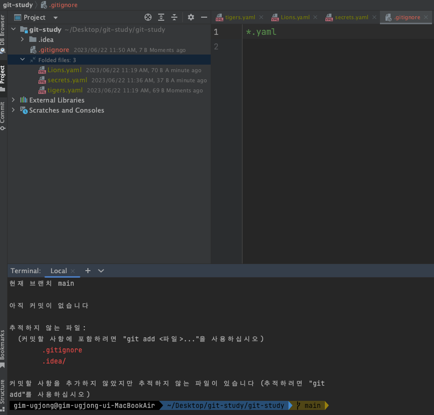 만약 위와 같이 .yaml 확장자의 파일을 전부다 git의 관리 대상에서 배제한다면 git status에 해당 파일들이 잡히지 않는다.