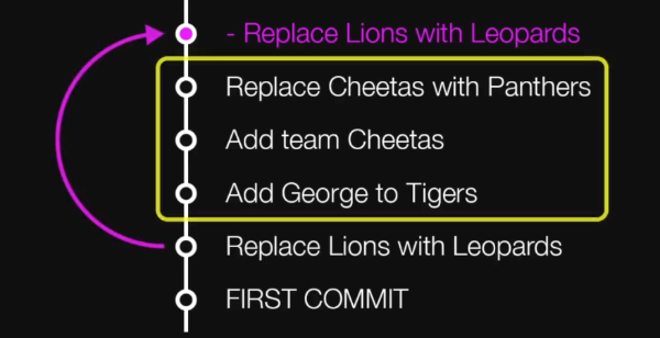 Reset은 말 그대로 시간을 과거로 되돌리는 방식이라고 이해하시면 좋습니다. Reset의 경우 현재 한 단계 전 시점인 Add team Cheetas로 되돌아가기 위해, 돌아간 이후의 커밋들을 히스토리에서 지워버리게 됩니다. 이때 히스토리를 지우는 행위는 git reset이 받는 옵션(soft, mixed, hard)에 따라 달라집니다.