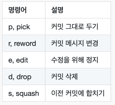 각 커밋에 대한 작업 옵션은 다음과 같습니다.