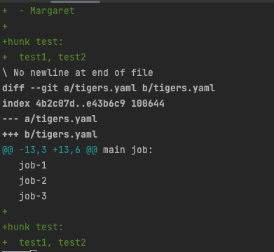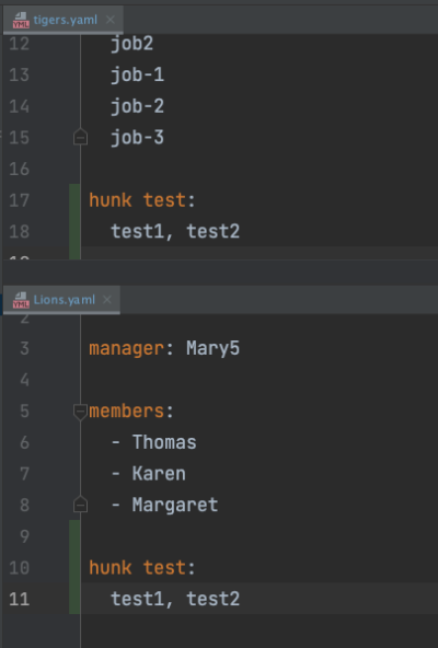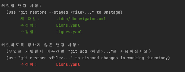 만약 한 파일 내에 있는 작업 내용들을 hunk를 기준으로 어떤것은 스테이징 한 반면, 어떠한 내용은 스테이징 하지 않는다면 위와 같은 상황을 보실 수 있습니다.(Lions.yaml이 양쪽 다 위치)