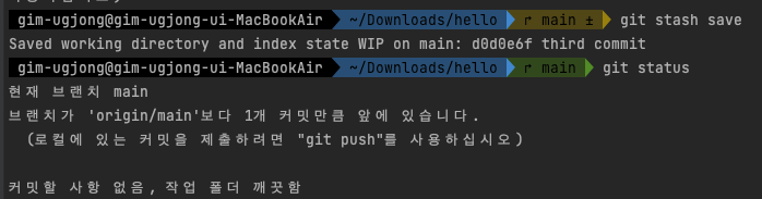 이때 이러한 변경 사항을 stash영역에 보내기 위해 아래 명령어를 작성합니다.