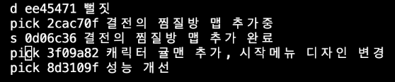 이때 뻘짓 앞에 pick이 아닌 d를 입력하게 되면 해당 커밋은 지워지게 됩니다.