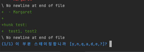 git add -p를 입력시 각각에 hunk에 대해 해당 부분을 스테이징 할 것인지 물어봅니다.