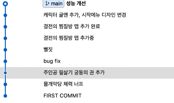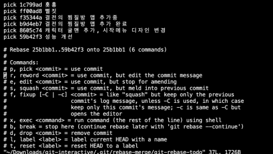 마지막으로 3번 작업(귤맨 추가와 시작메뉴 디자인 변경을 각각의 커밋으로 분리)을 하기 위해 우선 rebase -i 결전의 찜질방 맵 추가의 해시코드를 입력합니다.