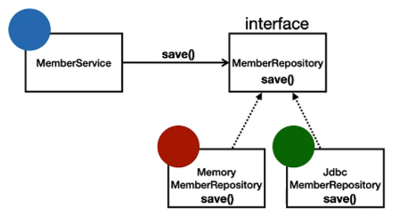 위와 같은 상황에서 Memory DB에서 jdbc로 바꾸어도 클라이언트 쪽 코드는 거의 변경할 필요가 없는 것이죠