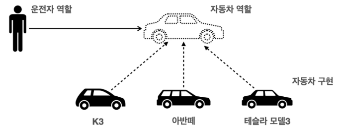 왜냐하면 자동차 역할이라는 일종의 인터페이스를 바탕으로 자동차(인터페이스 구현체)들을 만들었기 때문입니다. 즉 운전자는 자동차의 역할이라는 인터페이스에만 의존하고 있기에, 인터페이스를 바탕으로 만든 새로운 차가 나와도 운전자에게 영향을 미치지 않는 것이죠