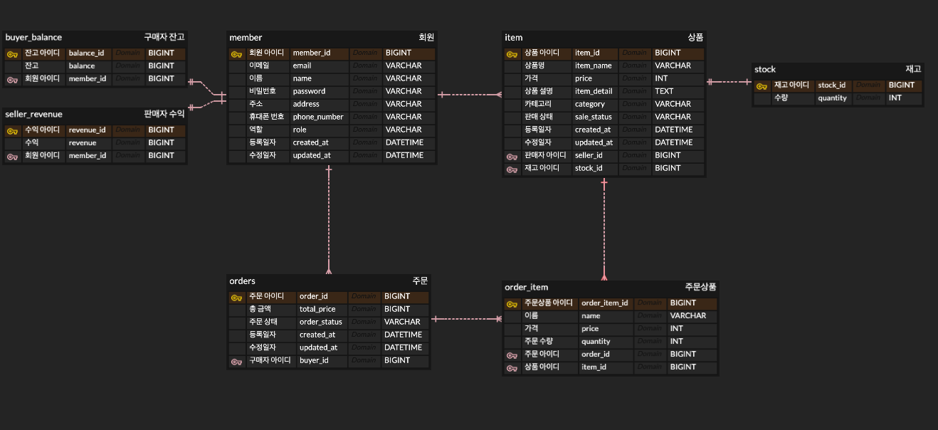 위 ERD를 보면 구매자의 주문 정보(Orders)가 상품(Item)이 아닌 Order_Item과 관계를 맺고 있는 것을 확인할 수 있습니다.