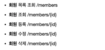 즉 위와 같이 회원을 등록 및 수정하고, 조회하는 작업을 동사로 표현하는 것이 아닌 회원이라는 리소스 자체를 URI에 매핑하는 것입니다.