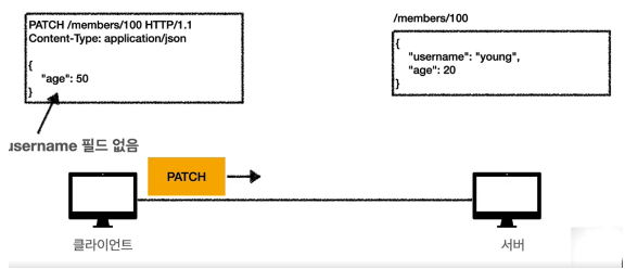 PATCH 메서드로 해당 리소스 경로에 "age":50 데이터를 보내면 age 필드의 값만 변경되기 때문에 최종적으로 username:young, age:50의 데이터를 가지게 됩니다.