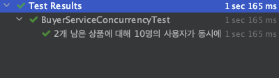 저는 2개 남은 상품에 대해 10명의 사용자가 동시에 주문 요청을 보냈을때, 2명의 사용자의 주문 요청만이 성공하는지에 대해 테스트해보았습니다.(10명의 사용자 모두 1개씩 주문을 요청합니다)